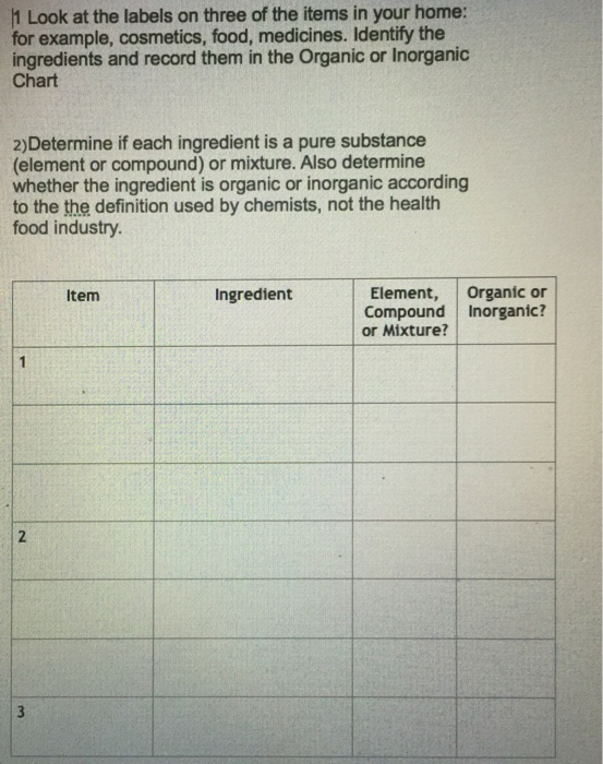 Classroom Resources | Discovering Chemical Elements in Food - AACT Choose 3 foods, and begin your investigation (it is helpful if your food choices have nutritional labels): Recommended daily calories for you: Food 1: Food 2: Food 3: 1: ... Identify 3 elements or compounds in your foods with harmful effects. If there are healthy and unhealthy limits, mention these. ... Food Additives and Compounds | Nutrition.gov Consumer Info About Additives & Ingredients. HHS, Food and Drug Administration, Center for Food Safety and Applied Nutrition. Find information from the Food and Drug Administration ( FDA) on benzene, color additives, fat substitutes, food irradiation, preservatives, sweeteners, sulfites, and more.